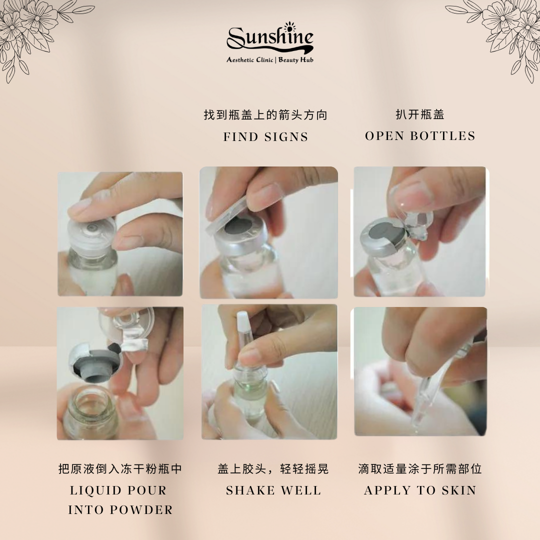 - Step 2: Pour the solvent into the freeze-dried powder. Sheathe the transparent rubber head on the paired freeze-dried powder bottle. Shake it up slightly.